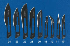 顯微外科解剖刀片,無菌獨(dú)立包裝,共有九種不同樣式,從右往左依次為10、11、12、15、20、21、22、23、24、25號(hào),滿足您不同的實(shí)驗(yàn)操作,訂購時(shí)需要指明幾號(hào)刀片。