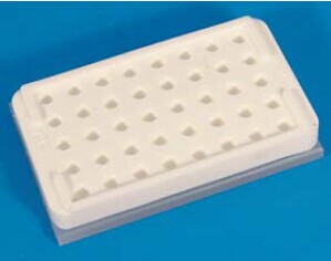 EMS染色盤,硅膠制造,用于電子顯微鏡樣品包埋后的染色和免疫組織化學操作時,其優(yōu)勢遠勝于現(xiàn)行其他染色裝置?;瘜W蝕刻過程、抗體孵育和染色都能在EMS染色盤小圓錐孔內操作。外尺寸長127.5mm、寬85.5mm、厚11.5mm, 8行12列共96個錐形孔(形狀類似微量滴定板),每個圓錐孔都是直徑7mm的倒錐形,深2mm,銅網(wǎng)漂浮或固定在其底端。圓錐孔能容納12-60µl溶液。可用Falcon 3072 Microtest™ III 96孔盤做蓋子。