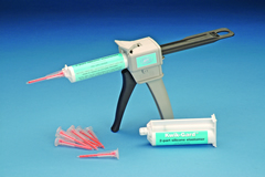 Sylgard 184硅橡膠(Kwik-Gard™Start Up kit)特別適合科學(xué)研究應(yīng)用??梢允∪セ旌蟽煞N膠帶來的麻煩和時(shí)間的浪費(fèi)。當(dāng)推進(jìn)注射器時(shí)自動(dòng)在尖部混合,無任何氣泡,直接用于位點(diǎn)。更換尖端就可以重復(fù)使用,有效避免了浪費(fèi)。每針筒含有37ml的硅膠樹脂和固化劑,針筒頭(tip)的體積0.75ml。針筒內(nèi)的硅橡膠是Sylgard 184,液體組分組成的雙組分產(chǎn)品,包括硅膠組分與固化劑。硅膠組分與固化劑按10:1重量比完全混合,形成中等粘度混合液,混合液將固化成為具有韌性的透明彈性體,硅橡膠在25℃的溫度固化需要24h,無放熱現(xiàn)象,無需二次固化。