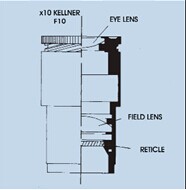 分劃板對潔凈度要求極高,任何微小的灰塵都會(huì)在觀測時(shí)產(chǎn)生很大的黑點(diǎn),同時(shí)分劃板的安裝位置精度要求極高,因此,盡量不要拆卸,如果拆卸,一定要按原樣復(fù)原。選擇分劃板直徑必須與待用目鏡相匹配,并且直徑要略小于目鏡。不同的目鏡其分劃板內(nèi)置位置稍有差別。下圖給出內(nèi)置于開涅爾目鏡示意圖: