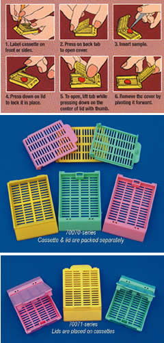 由乙?;酆衔镏谱鞫桑@種特殊的高密度聚合物,能使樣本安全的浸沒在溶液中。包埋盒對(duì)大多數(shù)組織溶劑有抗性,盒表面柵格能為液體交換提供最大流量、最適排水。蓋子或者附著在包埋盒上,或者獨(dú)立包裝。根據(jù)使用需求蓋子能夠隨時(shí)開、合,隨時(shí)安全鎖定,不會(huì)損傷樣本。包埋盒三面均有較大的空白標(biāo)記區(qū)域,方便使用。
